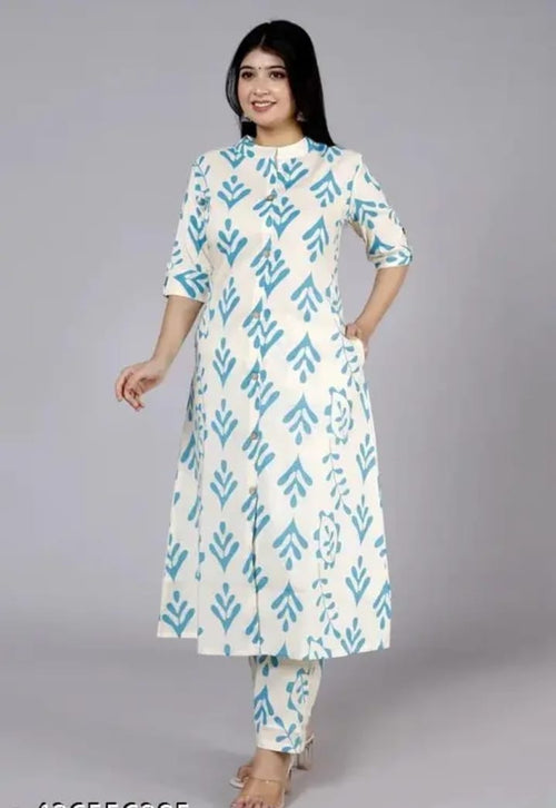Cream & Green Floral Printed A-Line Kurta With Pants for Women | Elegant Summer Wear
