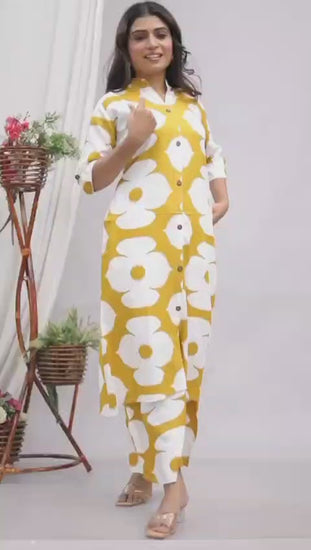 Make a bold and refreshing style statement with this vibrant yellow abstract floral printed co-ord set, designed for women who love modern prints blended with everyday comfort. Crafted from soft, breathable fabric, this co-ord set features a stunning oversized floral pattern in bright mustard yellow and white—perfect for adding a touch of freshness to your daily wardrobe.
